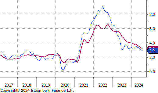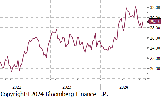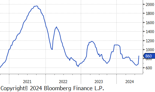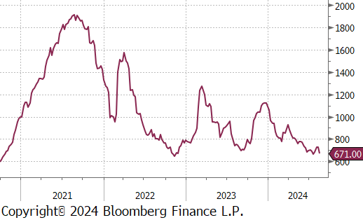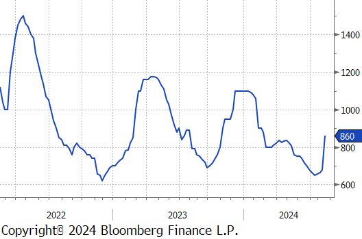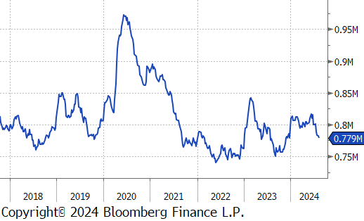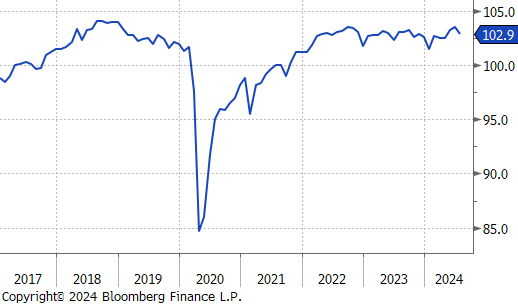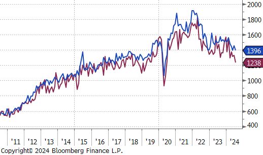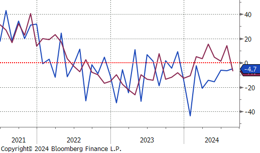 The first 2 of the 5 FED Manufacturing Surveys for August were released and highlighted the sectors ongoing challenges as it continues to struggle with the pressures of high interest rates. Philadelphia, which had been the strongest among the regional surveys, unexpectedly dropped to -7 vs the forecasted 5.2, the first contraction since January. Conversely, NY Empire exceeded expectations, rising to -4.7 vs -6, the highest reading in six months, albeit still in contraction. Additionally, July’s Industrial Production also showed signs of weakness, falling by -0.6% vs a -0.3% decline. However, this larger-than-anticipated drop has been mainly attributed to the disruptive impact of Hurricane Beryl.
