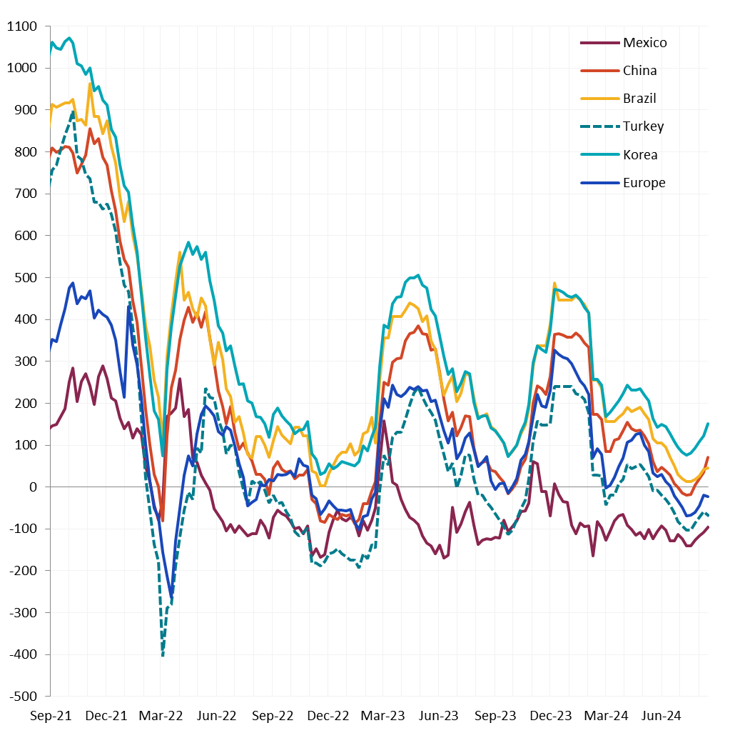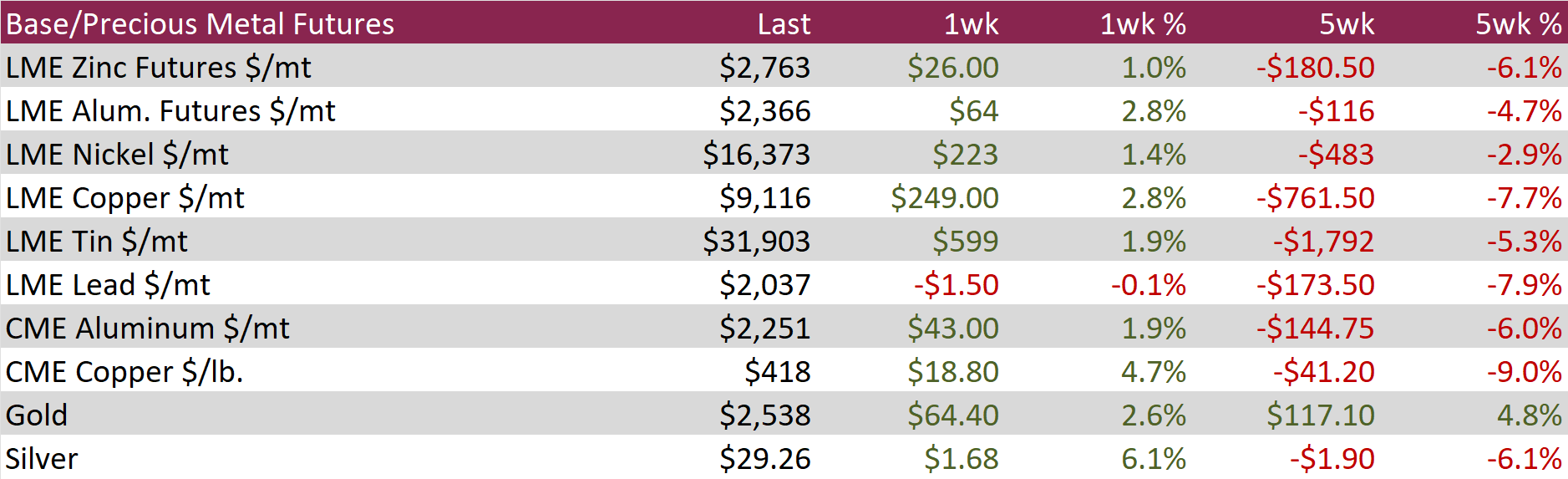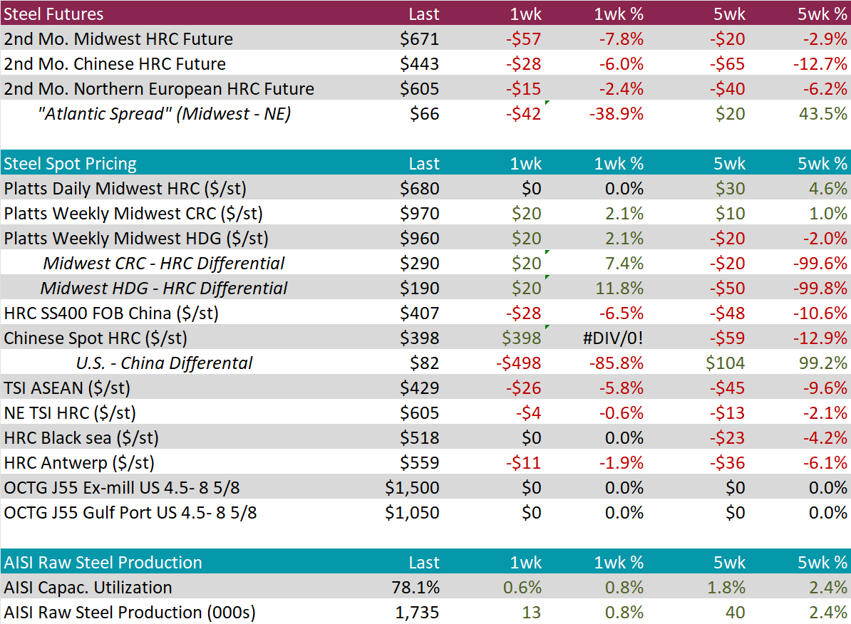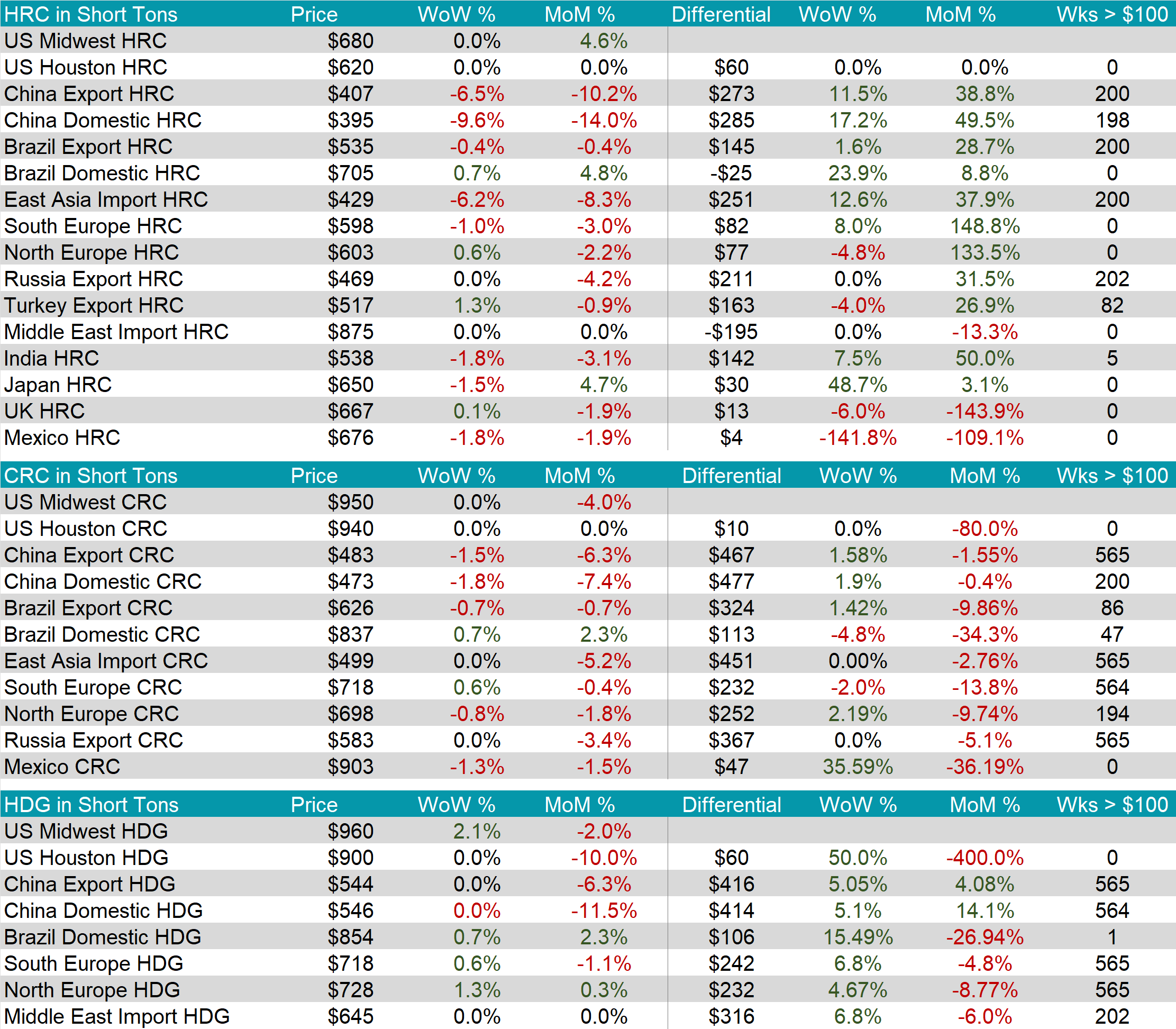 Watched global differentials were mixed this week, with China Export and Domestic HRC dropping by -6.5% and -9.6%, respectively. Korea’s Import HRC fell by -6.2%, while Turkey Export HRC rose by 1.3%.