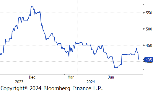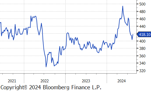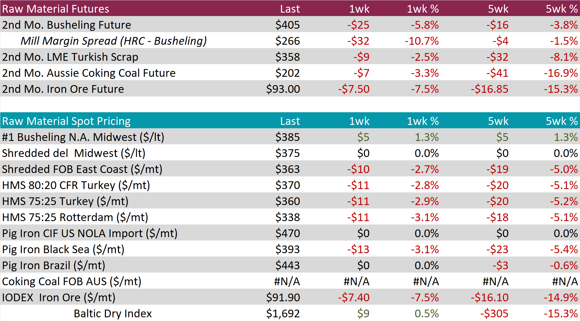 The busheling 2nd month future dropped by $25 or -5.8% to $405, falling to its lowest price since early July.