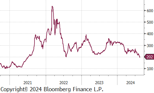 The Aussie coking coal 2nd month future fell by $7 or -3.3% to $202, marking the second consecutive week of price declines, reaching the lowest price since July 2021.
