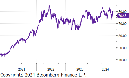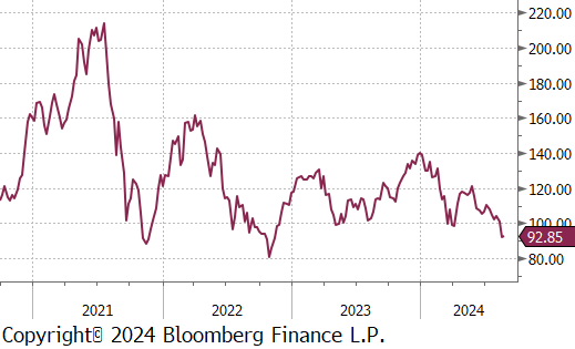 The iron ore 2nd month future decreased by $7.50 or -7.5% to $93, hitting the lowest price since November 2022.