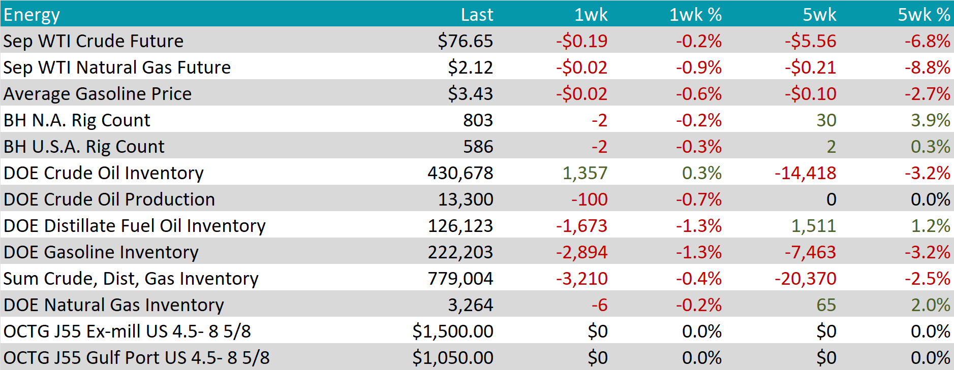 The Baker Hughes North American rig count reduced by 2 rigs, bringing the total count down to 803 rigs. Similarly, the US rig count dipped by 2 rigs, bringing the total count to 586 rigs – marking the eleventh week under 600.