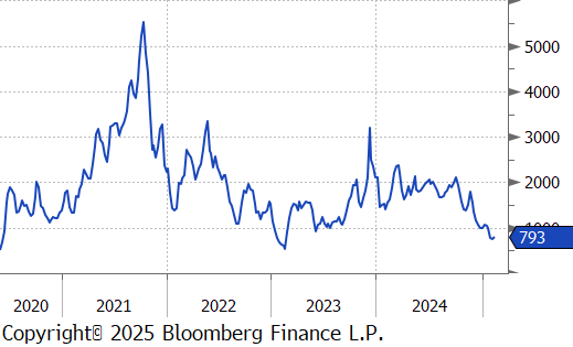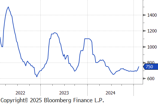 The HRC spot price surged by $30 or 4.2% to $750, marking the third consecutive week of increases and the highest price since May 2024. At the same time, the HRC 2nd month future jumped by $21 or 2.7% to $805, marking the second consecutive week of increases and the highest since April 2024.