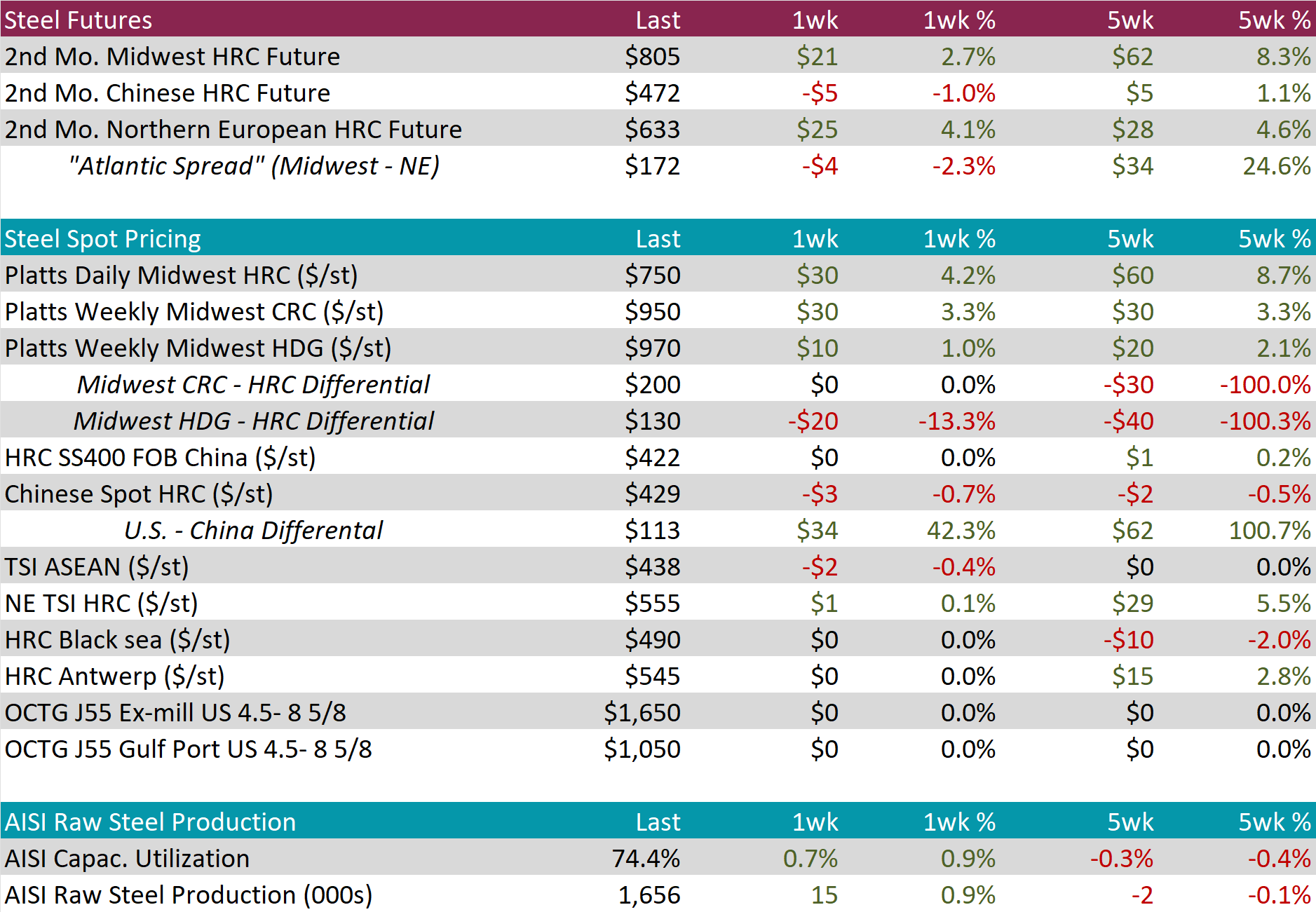 • Domestic Steel Prices: HRC spot pricing and the HRC 2nd month future both continued to rise, with each hitting their highest level since May and April, respectively. HDG also increased further.