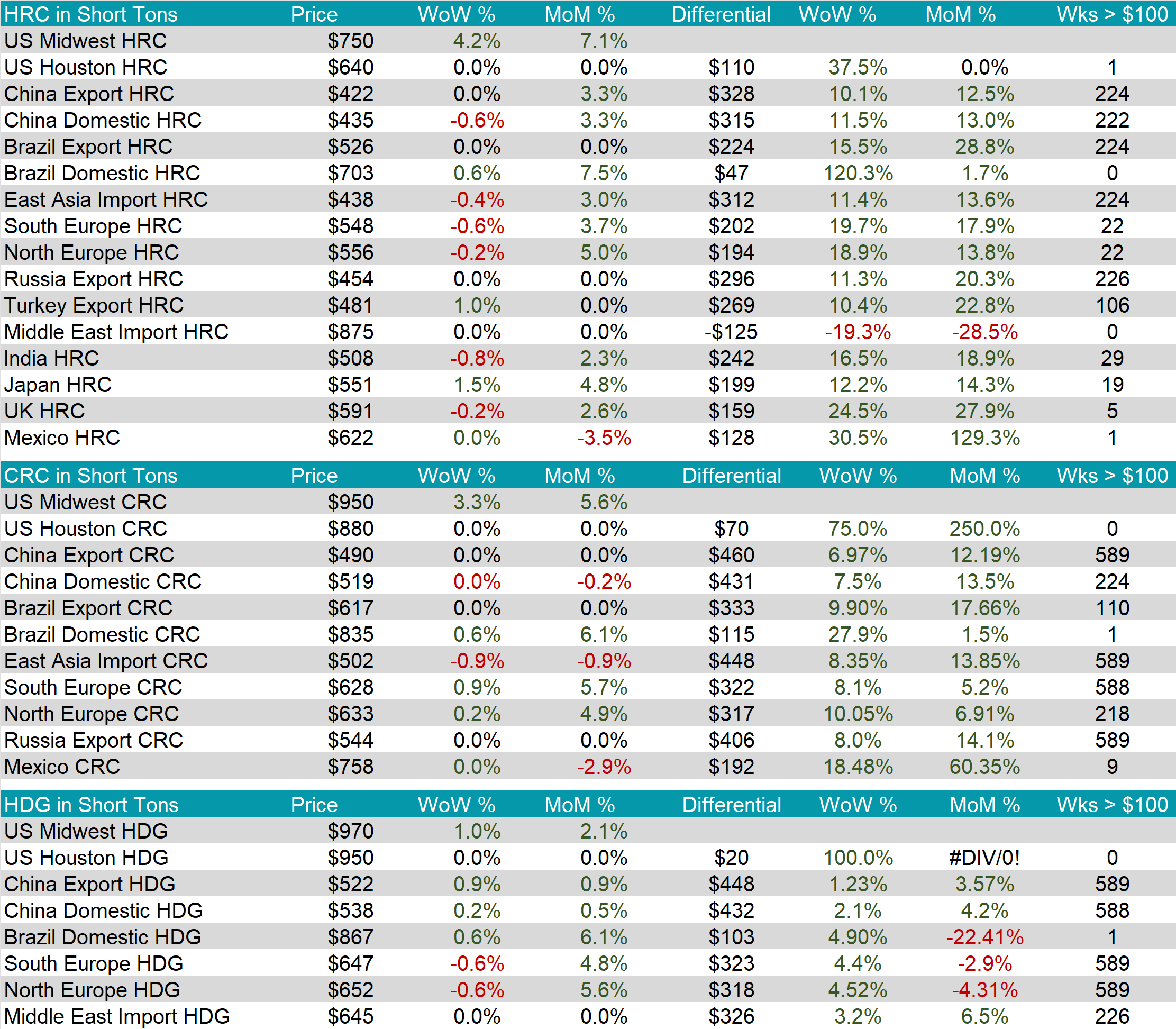 Tandem products both increased, with CRC rising by $30 and HDG up by $10, resulting in the HDG – HRC differential to fall by $20 to $130.