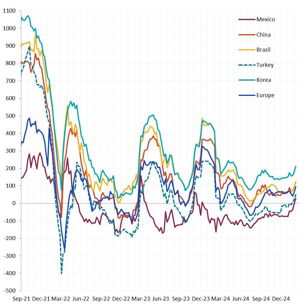 Differentials mainly expanded over the week, with Korea’s HRC price slipping by -0.4%, North Europe down by -0.2%, and Turkey Export HRC rising by 1.0%.