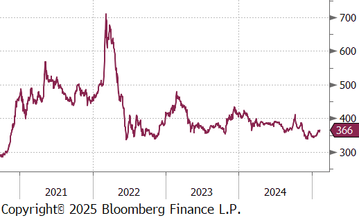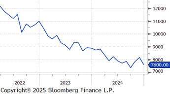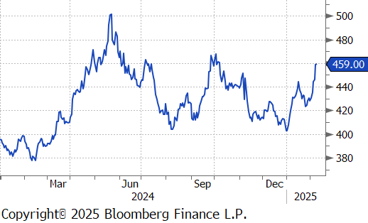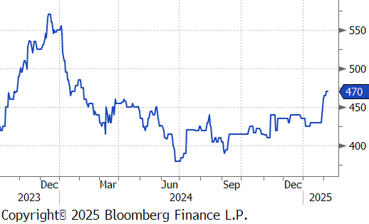 Copper futures rose by $31 or 7.2% to $459, hovering near four-month highs as tightening supply and recovering demand fueled bullish sentiment. Supply concerns mounted as delays caused by repairs and aging mines in Chile, the world’s top copper producer, threatened to constrain output. Meanwhile, demand rebounded as Chinese buyers returned to the market after the Lunar New Year, and U.S. consumers increased stockpiling ahead of potential trade restrictions. Heightened trade tensions added further uncertainty, as China’s retaliatory tariffs on select U.S. exports neared implementation, and German Chancellor Olaf Scholz warned that the EU is prepared to respond “within an hour” to any U.S. tariffs on European goods.