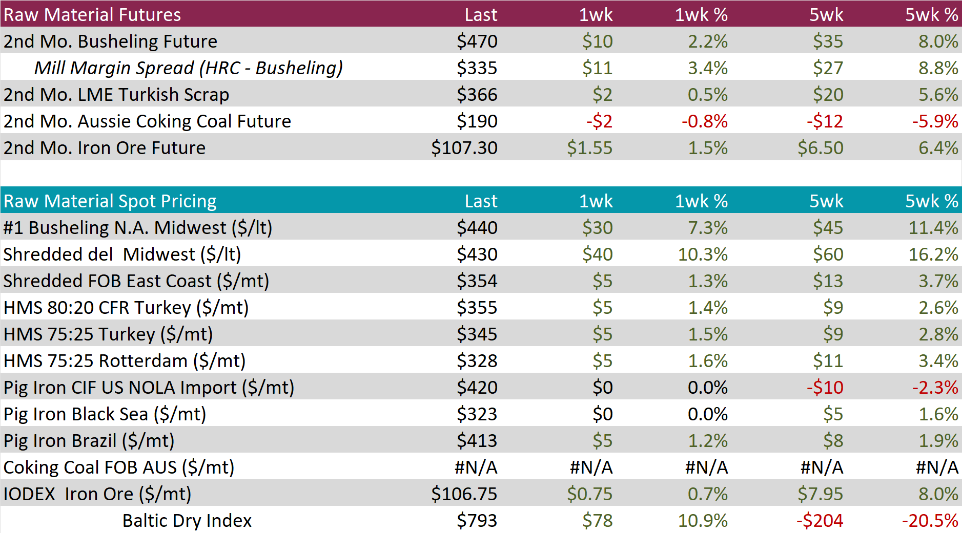 • Raw Materials: Spot prices and futures continued to see increases, except for the Aussie coking coal 2nd month future.