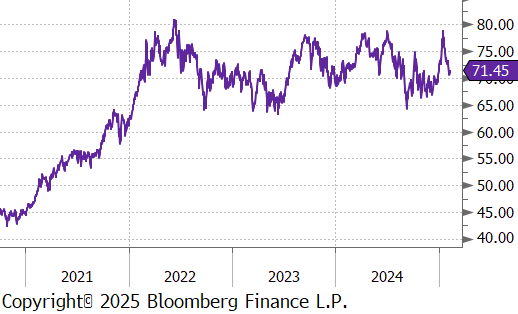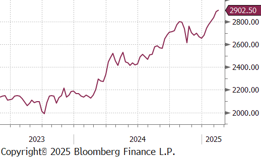 Gold advanced by $52.60 or 1.9% to $2,888, setting a record high as escalating trade tensions and global monetary easing fueled safe-haven demand. Expectations of looser monetary policy from major central banks continued to support non-yielding gold. Investors still anticipate two Federal Reserve rate cuts in 2024, despite strong labor data, aligning with the FOMC’s projections. Additionally, the Bank of England surprised markets with a more dovish-than-expected rate cut last week, while the Reserve Bank of India implemented its first rate reduction since its pandemic-era policy measures nearly five years ago. Further boosting bullion, the People’s Bank of China increased its gold reserves for the third consecutive month in January, underscoring ongoing central bank demand.