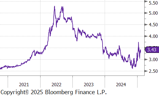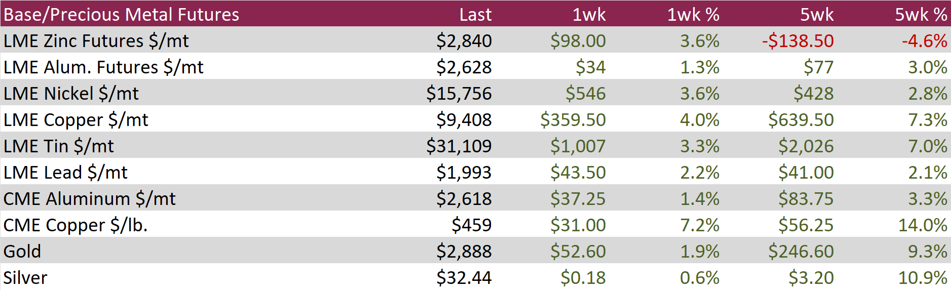 Aluminum futures increased by $34 or 1.3% to $2,628, supported by broad gains in base metals amid ongoing supply concerns and improving manufacturing indicators. In China, aluminum production reached a record 44 million tons in 2024, nearing the government-imposed cap of 45 million tons set in 2017 to prevent oversupply and meet carbon emissions targets. Also, the threat of looming tariffs continue to influence the price.