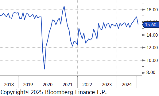In January, Wards Total Vehicle Sales dropped to 15.60m from December’s 16.80m sales, missing the expectation of a decline to 16m. This is the lowest level of sales since August. Somewhat surprisingly, auto inventories and production remain in a downtrend. We anticipate that the drawdown in inventories will lead to an uptick in steel consumption over the next couple of months but anticipate that it will be short-lived.