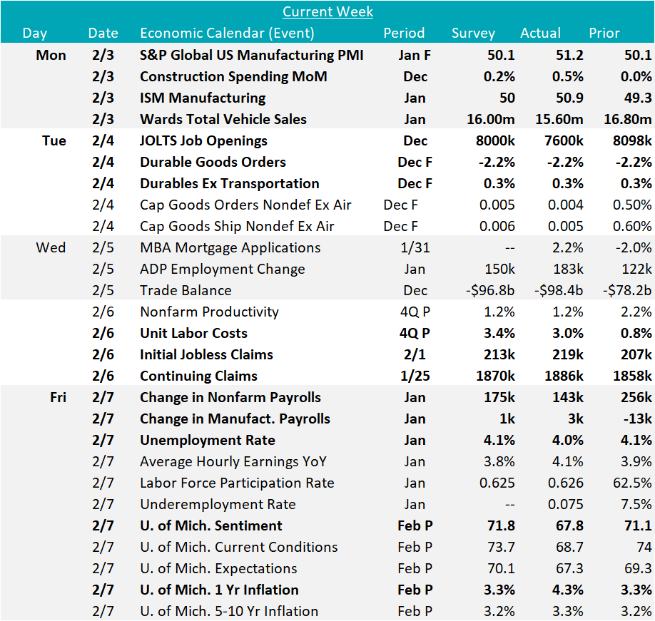 • Economic Data: The week was packed with fascinating economic releases bridging the transition between the two administrations. Industrial data broadly came in better than expectations, while a flurry of labor market data and revisions put many of the questions around whether cracks were showing to rest.
