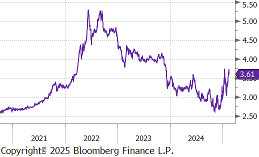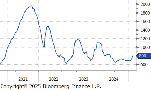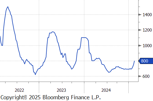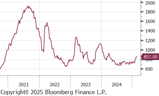 The HRC spot price surged by $50 or 6.7% to $800, hitting the highest price since May 2024 and marks the third consecutive week of notable increases. At the same time, the HRC 2nd month future jumped by $52 or 6.5% to $857, similarly marking the third consecutive week of notable increases and the highest price since April 2024.
