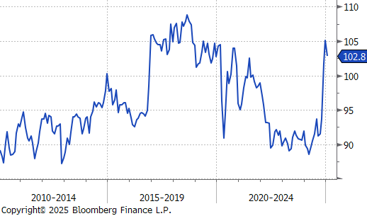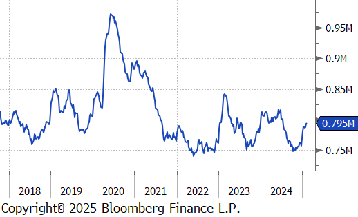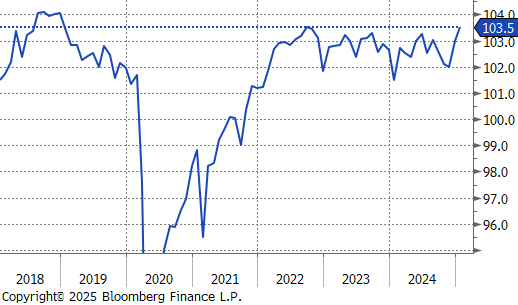 January Industrial Production data surprised to the upside, increasing by 0.5% month-over-month, surpassing the forecasted 0.3%, with Capacity Utilization ticking up by 77.8% (vs 77.7%) from December’s 77.6%. This points to resilience in the sector, signaling that demand may be holding steady. However, Manufacturing (SIC) Production missed expectations, declining by -0.1%, compared to the anticipated 0.1% increase, following December’s 0.6% rise, suggesting that the manufacturing sector is still facing some challenges.