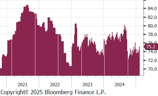 Mill production resumed its upward trend, with capacity utilization continuing to tick up, this week by 0.8% to 75.2%, bringing raw steel production up to 1.675m net tons.