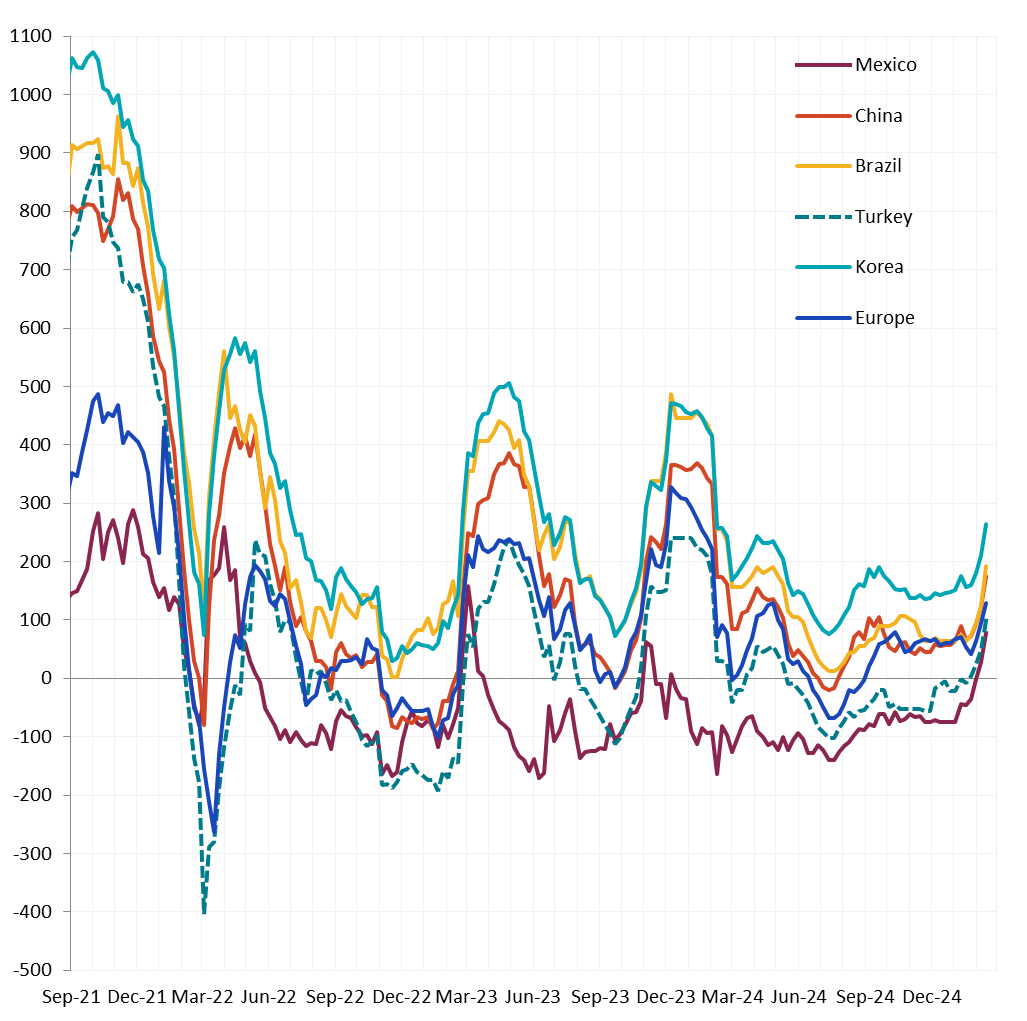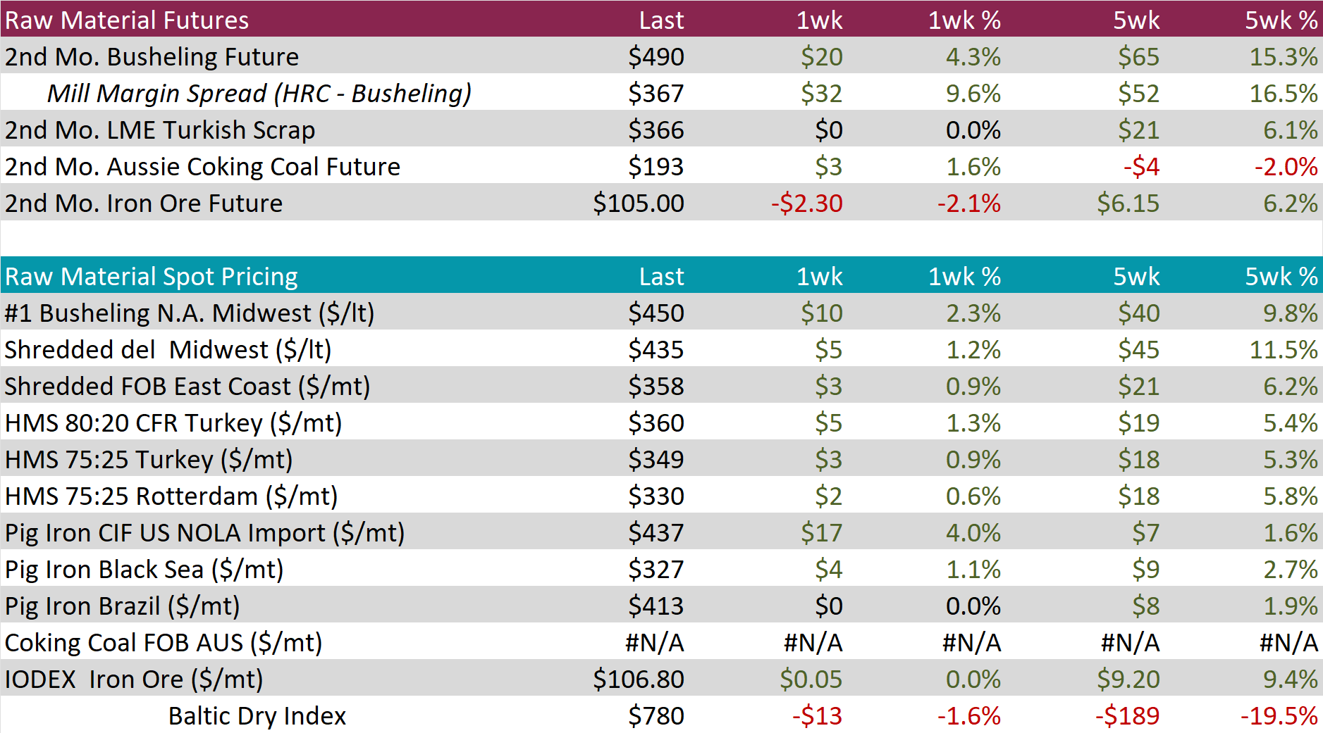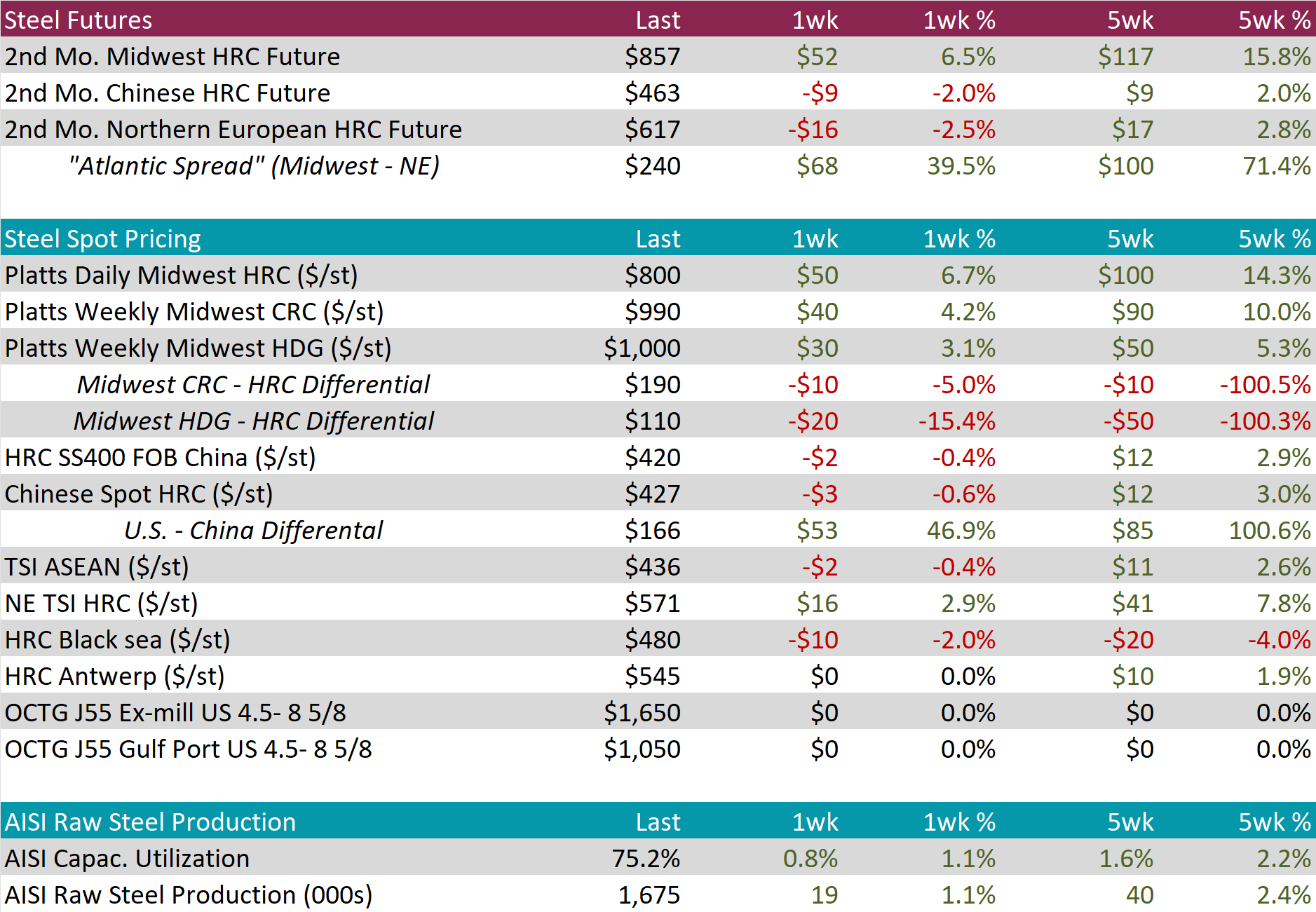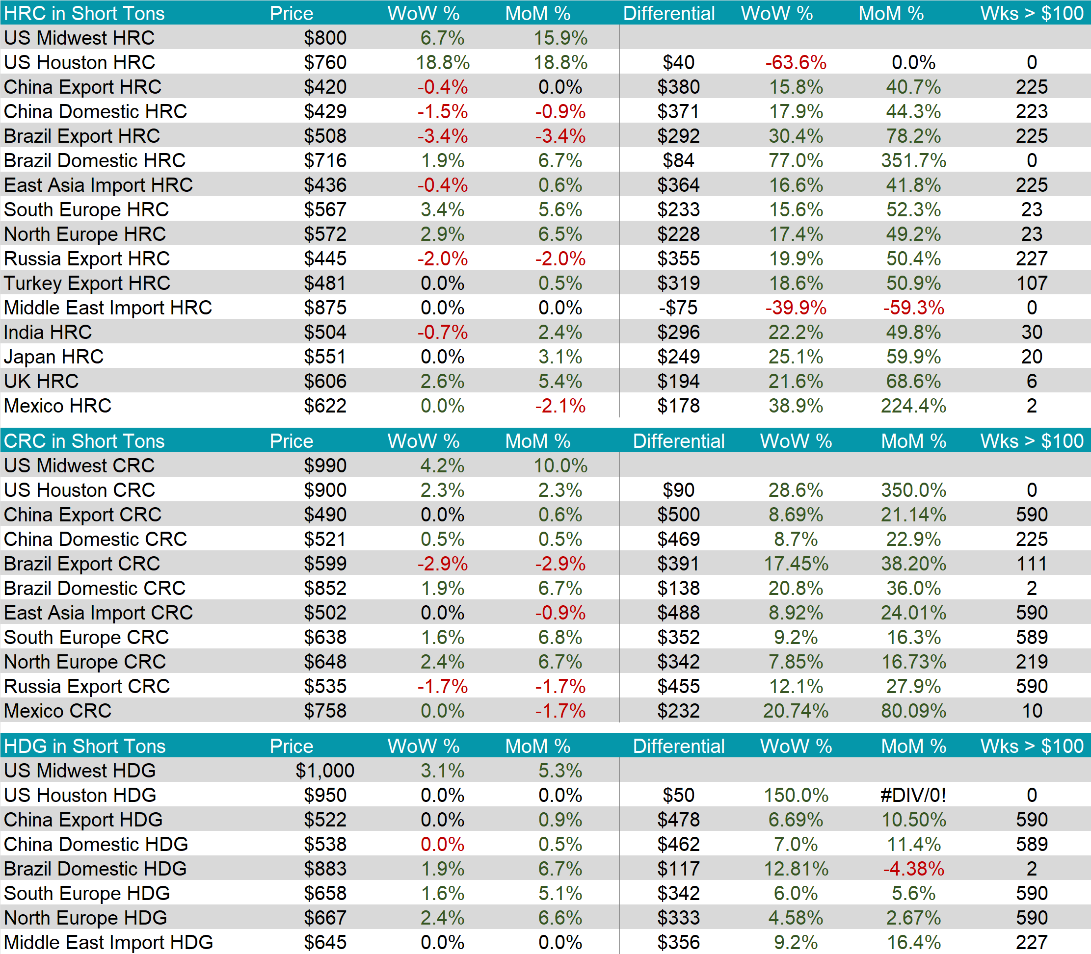 All watched global differentials expanded this week. China’s Export HRC and Korea’s HRC were both down by -0.4%, Brazil Export HRC fell by -3.4%, and Russia Export HRC fell by -2%, while N Europe HRC rose by 2.9%.