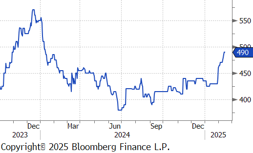 The 2nd month busheling future soared by $20 or 4.3% to $490, continuing its upward trend to reach the highest level since January 2024.