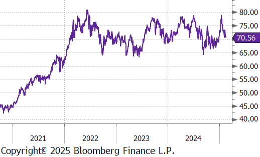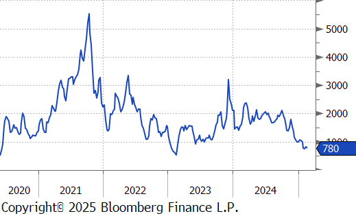 The Baltic Dry Index fell by $13 or -1.6% to $780, retreating from last weeks rebound.