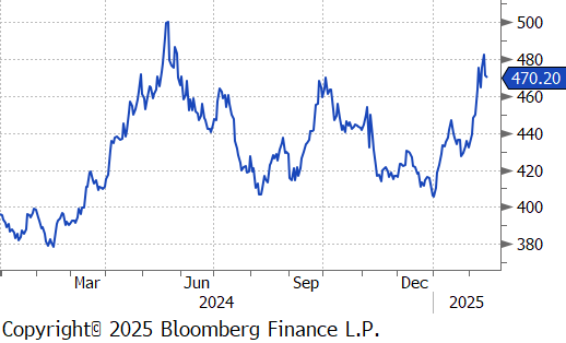 Aluminum futures rose by $10 or 0.4% to $2,638 as expectations of tighter supply and recovering manufacturing demand supported prices. China produced a record 44 million tons of aluminum in 2024, but output is set to slow significantly as Beijing enforces its longstanding production cap of 45 million tons, introduced in 2017 to curb excess supply and meet carbon emission targets. This comes despite Beijing’s fiscal stimulus measures aimed at boosting consumption, which could lead to an expansion in the budget deficit. In the U.S., ISM data revealed that the manufacturing sector unexpectedly rebounded in January, marking its first expansion in over two years, further improving the demand outlook for aluminum. However, aluminum prices outside the U.S. remained under pressure due to ongoing tariffs imposed by President Trump, dampening demand for imported metal.
