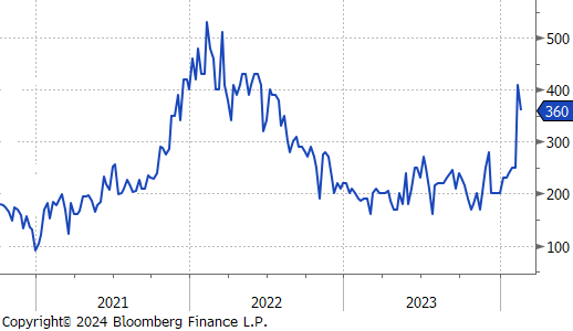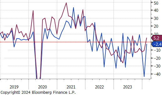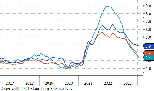 The inflation reports indicated a gradual easing, although slower than expected, suggesting higher for longer rates. Core CPI remained at 3.9%, defying expectations for a drop to 3.7%. PPI rose slightly to 2.0%, against a forecasted 1.6%. U. of Mich. 1-Yr Inflation Expectations increased slightly to 3.0%, and their 5-10 Yr Expectations stayed at 2.9%, not meeting the anticipated 2.8%. Sentiment rose to 80.0, above the expected 79.6, and NY Fed’s 1-Yr Expectations stayed at 3%.