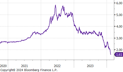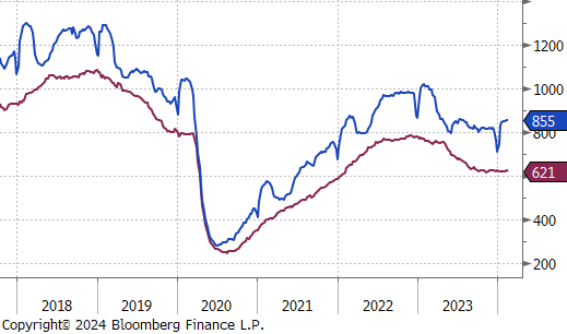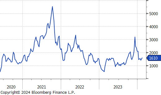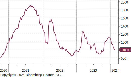 The HRC spot price remained static at $900, resulting in the 5-week price change to be down $200 or -18.2%. At the same time, the 2nd month future fell by $18 or -2.2% to $810, this is the lowest level hit since mid October 2023.