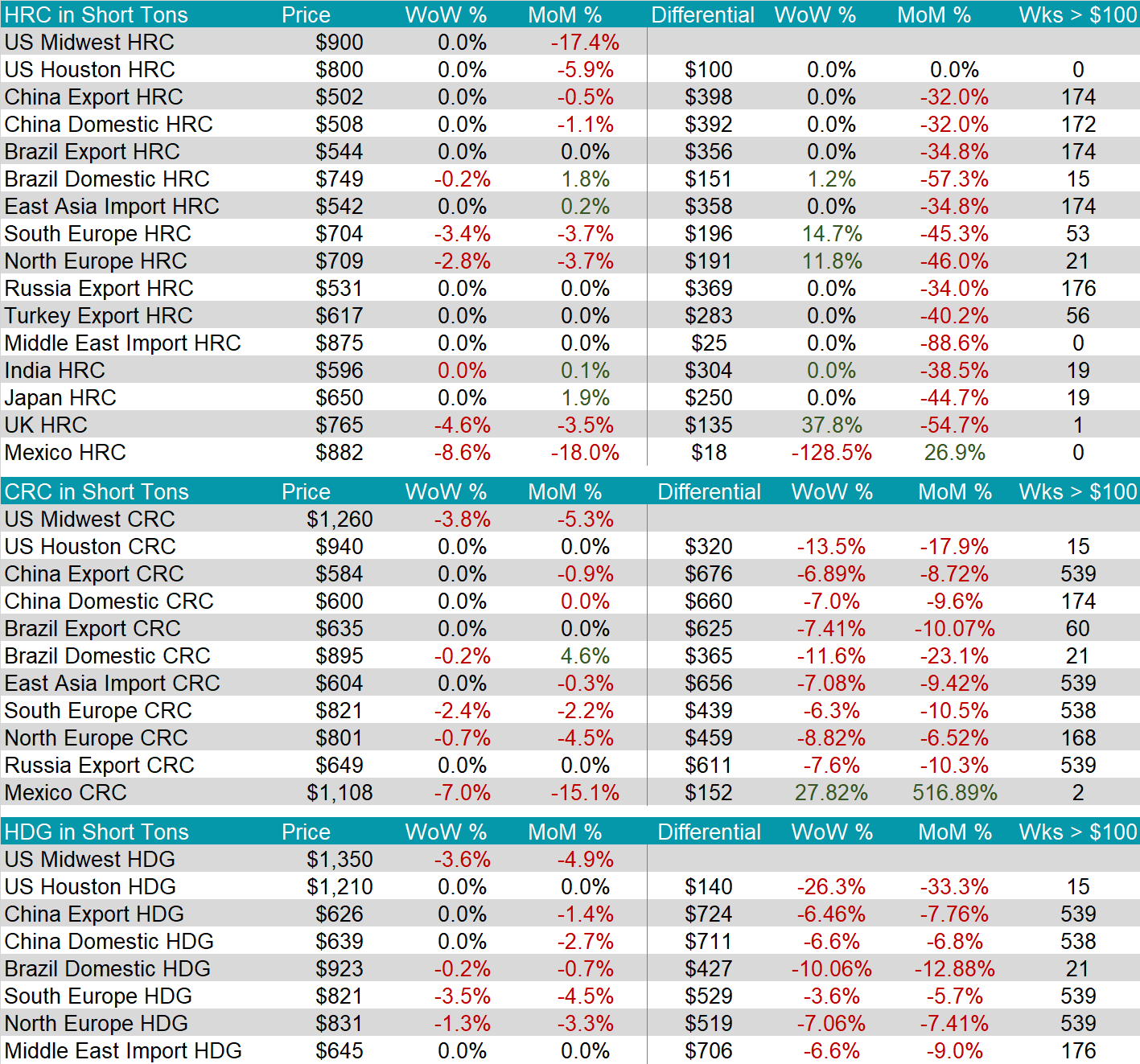 Watched global differentials either remained unchanged or increased, with South Europe HRC and Brazil HRC decreasing by -3.4% and -0.2%, respectively, being the only movers.