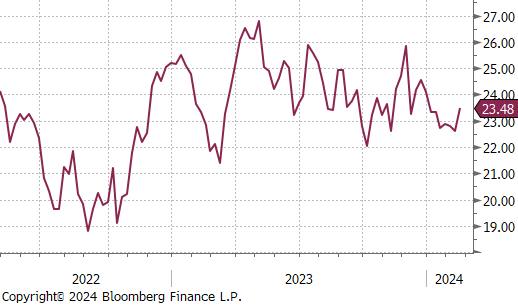 Silver rose by $0.88 or 3.9% to $23.48, a seven-week peak, in response to traders recalibrating their expectations for Federal Reserve rate cuts. The forthcoming minutes from the Federal Open Market Committee (FOMC) meeting and upcoming remarks from Fed officials are anticipated to shed light on the timing of the anticipated rate reduction. Whereas a cut in March was initially expected, the odds are now tilted towards a 53% chance of a 25-basis point decrease in June. The outlook for silver prices remains bullish for the year, underpinned by a weakening dollar and falling Treasury yields, as the Fed shifts towards more accommodative monetary policy.