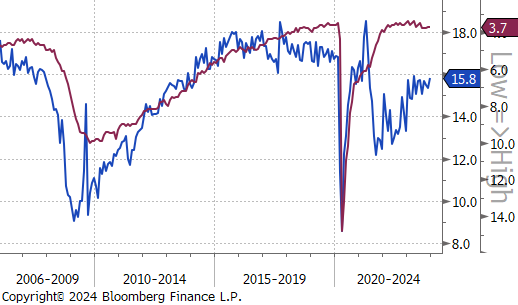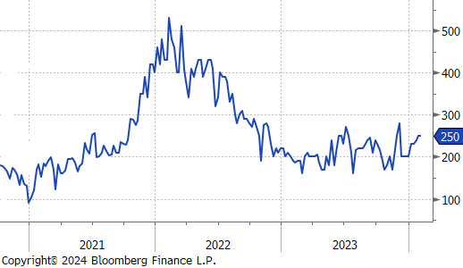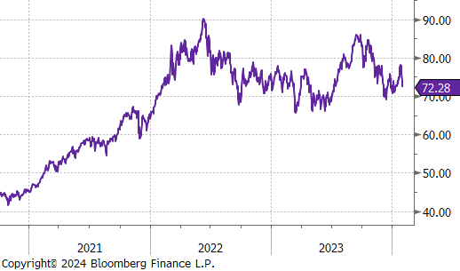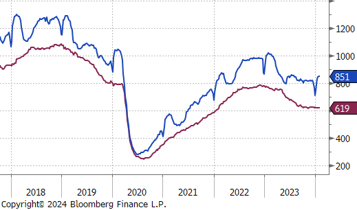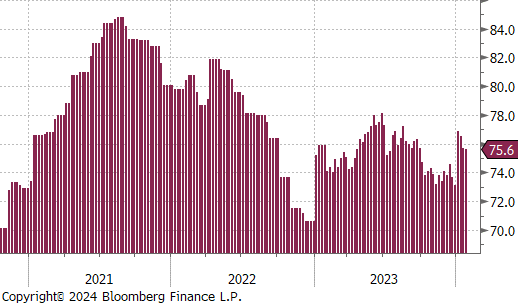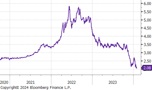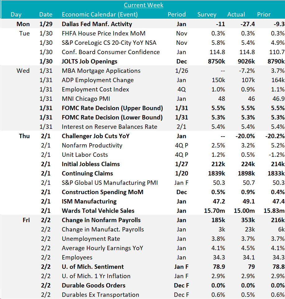 Last week’s jobs report including the revisions to November and December show that the labor market continues to hold up impressively, with another 353k jobs added to Nonfarm payrolls in January. Additionally, the clear indication of caution towards near-term cuts from FED Chair Powell in Wednesday’s press conference was supported by the data. Not only did unemployment fall to 3.7%, but hourly earnings YoY significantly beat expectations, up 4.5% versus 4.1%.