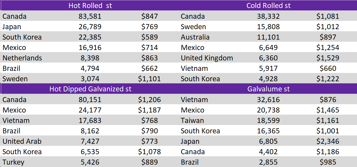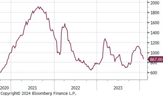 The HRC spot price fell by $20 or -1.9% to $1060. At the same time, the 2nd month future had a significant drop, falling by $76 or -8.1% to $867, reaching its lowest level since October 2023.