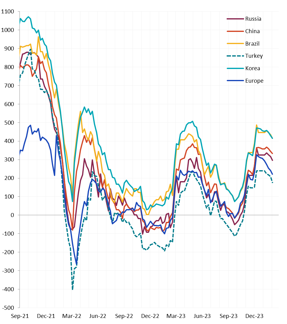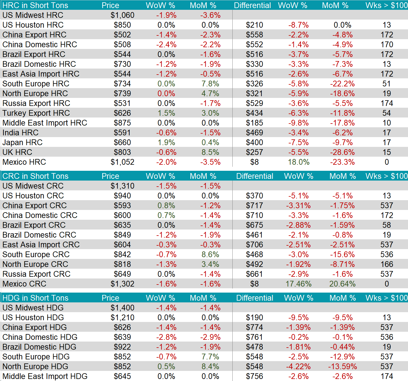 All watched global differentials fell further this week, with China and Brazil seeing the biggest price decreases, -2.4% and -1.2% respectively. Meanwhile, the Mexico HRC fell by -2.0%.