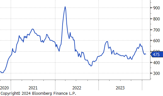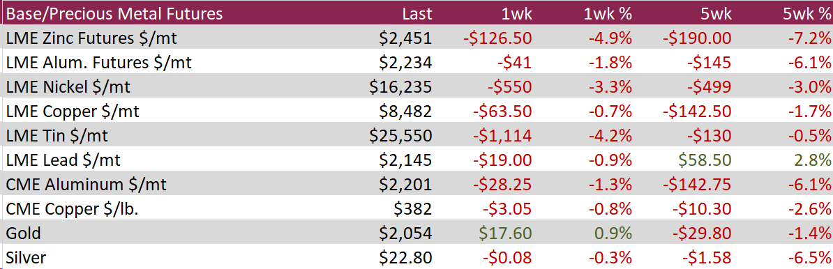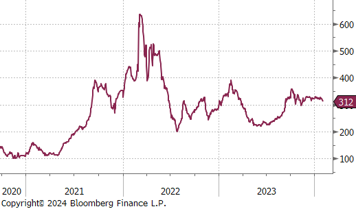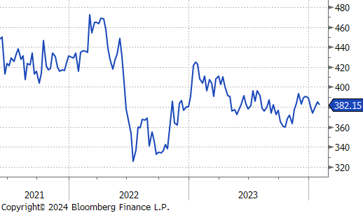 Copper dipped by $3.05 or -0.8% to $382, reflecting a week of losses fueled by dwindling demand from China and rising interest rates in the US. The contraction of China’s manufacturing sector for the fourth month in a row in January has added to the market’s pessimism. Additionally, a strong US employment report has tempered expectations for a rate cut by the Federal Reserve in March, forecasting a deceleration in industrial activity for the first quarter that may affect demand. On the flip side, a forecasted 5% drop in Glencore’s production in 2023, with a further reduction expected in 2024, might mitigate some of the downward pressure. Despite these headwinds, there remains hope that China will implement measures to bolster its economy.