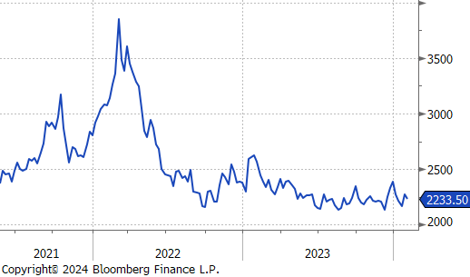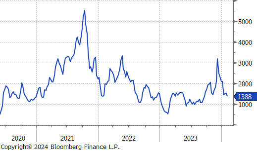 The Baltic Dry Index fell by $111 or -7.4% to $1,388, continuing its downward trend since hitting its most recent price high of $2,937 nine weeks ago.
