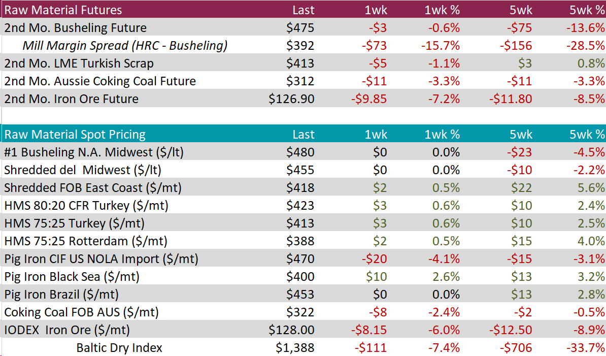 The 2nd month busheling future fell by $3 or -0.6% to $475, making the five-week price change to fall by $75 or -13.6%. At the same time, the busheling spot price remained stagnant at $480.