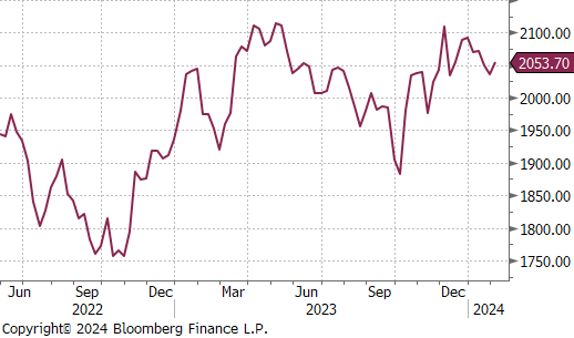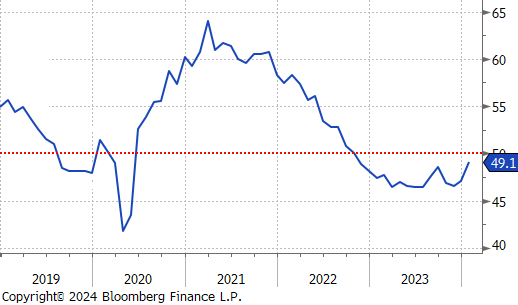 January manufacturing data showed further contraction, driven by a lack of longer-term demand. The Dallas FED Manufacturing Survey and MNI Chicago PMI both came in below expectations, -27.4 vs -11, and -46 vs -48, respectively. The ISM Manufacturing PMI surprised and printed above expectations up to 49.1 vs 47.2 but it remains in contraction territory. The driver of this move was decreasing inventories (43.9, down from 46.2) and the highest new order print (52.5) in 20 months.