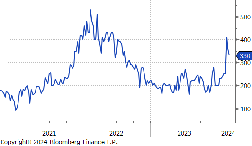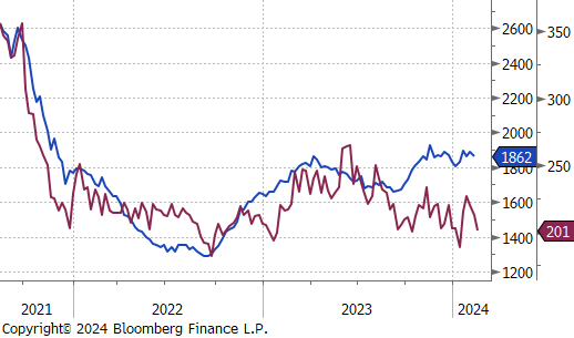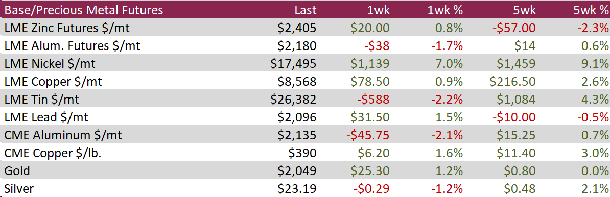 Aluminum fell by $38 or -1.7% to $2,180, after U.S. sanctions unexpectedly bypassed significant restrictions on Russian industrial metals. Market optimism had previously driven aluminum to its highest price since early February, anticipating supply constraints from potential sanctions linked to Russia’s geopolitical actions. However, the focus has now shifted towards demand-side concerns, influenced by China’s economic challenges, rising global borrowing costs, and the uncertain trajectory of the U.S. Federal Reserve’s policies.