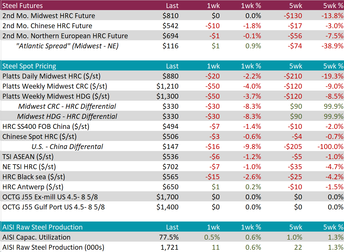 All watched global differentials declined, with the Turkey Export HRC experiencing the biggest decline of -2.2%. Another notable move was the US Houston HRC dropping by -5.0%.