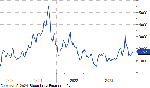 The Baltic Dry Index experienced another up-tick, increasing by $142 or 8.8% to $1,752, continuing to rebound.