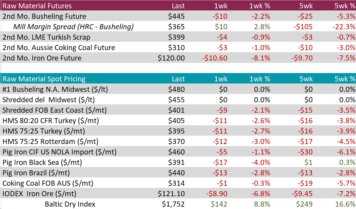 The 2nd month busheling future fell by $10 or -2.2% to $445, bringing the total price decline from most recent peak of $570 ten-weeks ago to $125. Meanwhile, the busheling spot price continued to remain stagnant at $480.
