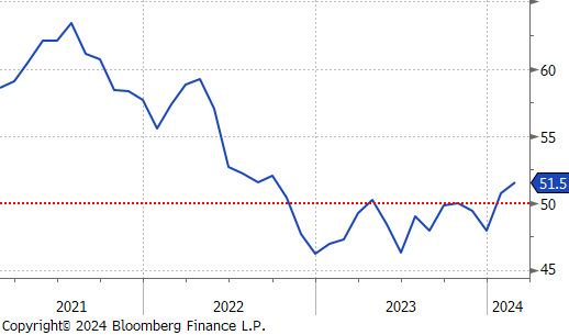 The preliminary S&P Global US Manufacturing PMI data showed an encouraging signal printing at 51.5, above expectations of 50.7. This is the strongest level of manufacturing expansion since September 2022 and the second consecutive print in expansion territory, a feat that has not occurred in 15 months. This is a promising signal, however, after the prolonged period of contraction, we are still months away from a full manufacturing recovery.