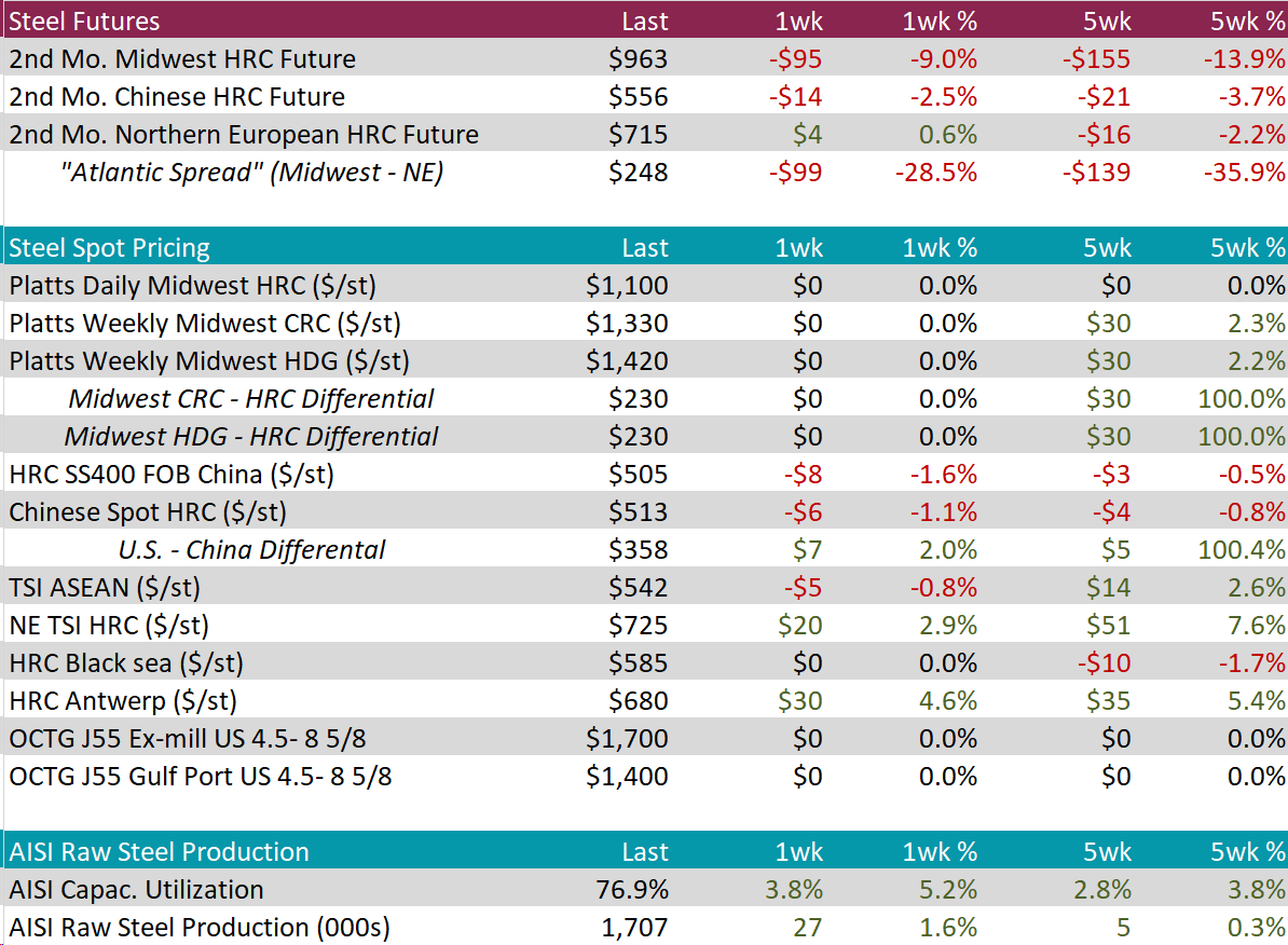 The HRC spot price continued to be static at $1,100, meanwhile the 2nd month future fell by $95 or -9.0% to $963, dropping back into $900s level after 9-weeks of being in the $1,000s.