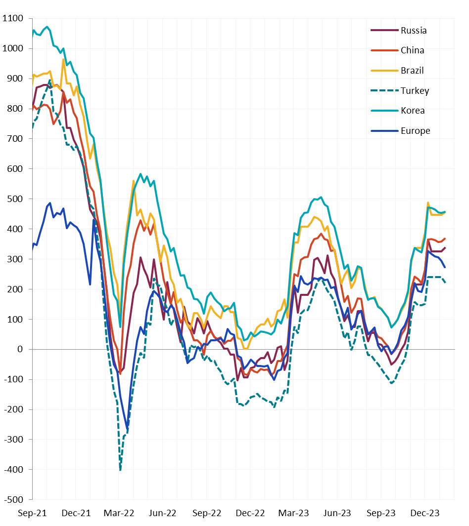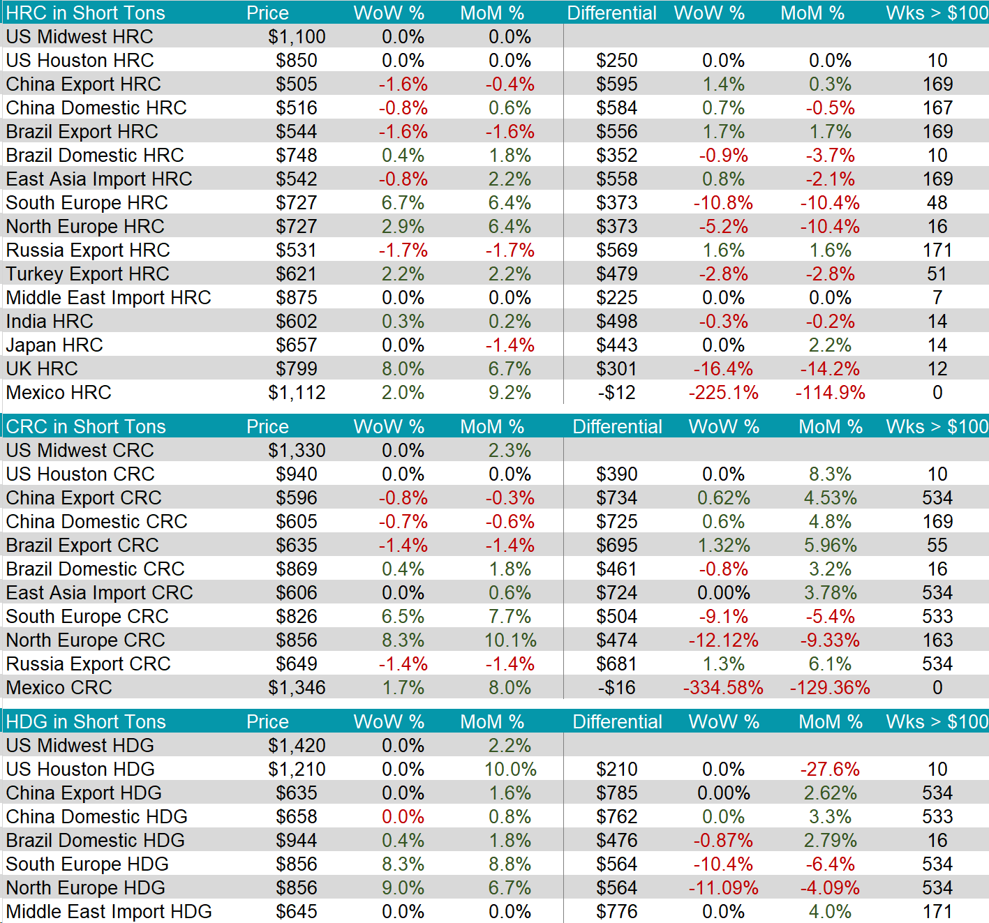 Watched global differentials were mixed this week, with South Europe HRC increasing by 6.7% and Brazil and China Export HRC both decreasing by -1.6%. Another notable country was the UK HRC rising by 8.0%.