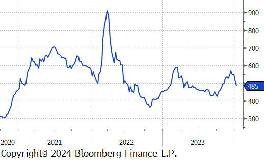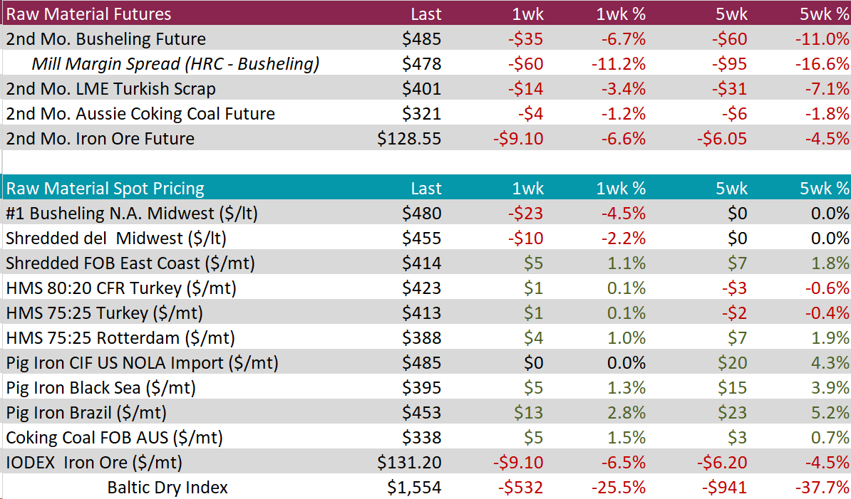 The 2nd month busheling future fell by $35 or -6.7% to $485, continuing its drop from recent price high of $570 and the lowest it has been since late October. At the same time, the busheling spot price fell back down to $480, decreasing by $23 or -4.5%, after being at $502.50 for 4-weeks.