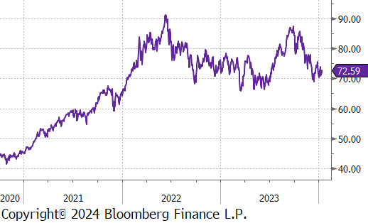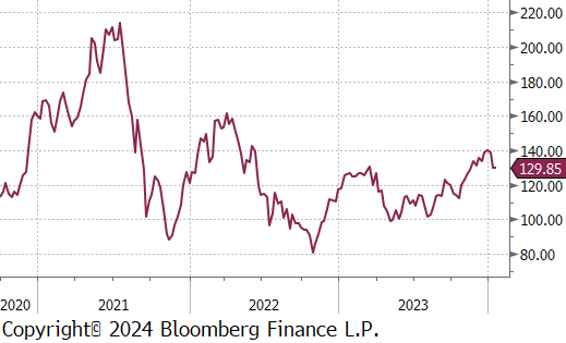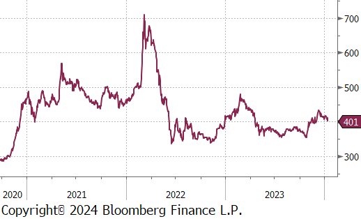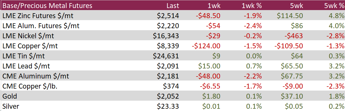Aluminum futures continued its fall from the 8-month high of $2,387, dropping by $52 or 2.4% to $2,220. This decline was primarily due to the anticipated increase in the availability of key input materials. The price surge at the end of the year, caused by an explosion at a fuel depot in Guinea was short-lived. The subsequent investments from the UAW in Guinea’s bauxite infrastructure helped alleviate fears of a supply shortage, stabilizing prices. Furthermore, expectations of China’s stimulus measures have maintained steady demand.
