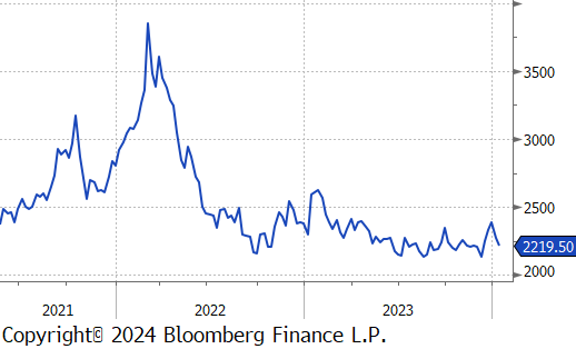 The Baltic Dry Index continued to drop, this week decreasing by $532 or -25.5% to $1,554, the lowest level seen since early-November and resulting in the 5-week price change dropping by $941 or -37.7%.