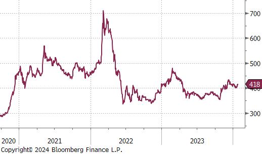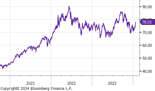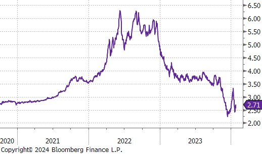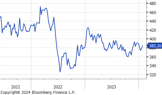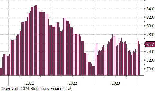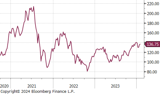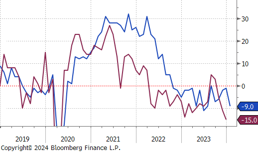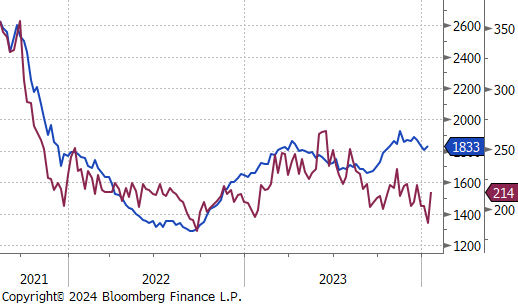 Manufacturing data continues to provided a mixed view on the potential for a near-term industrial recovery. The January readings for Richmond & Kansas City FED Manufacturing Surveys both came in below expectations, -15 vs -8, and -9 vs -3, respectively. The Richmond print was concerning, with expectations of an improvement versus an actual print at its lowest level since February 2023, while KC, which had been showing signs of recovery, fell much further than anticipated. On the other hand, January’s preliminary S&P Global US Manufacturing PMI index printed significantly above market expectations and improved from the prior month, 50.3 vs 47.6, and 50.3 vs 47.9.