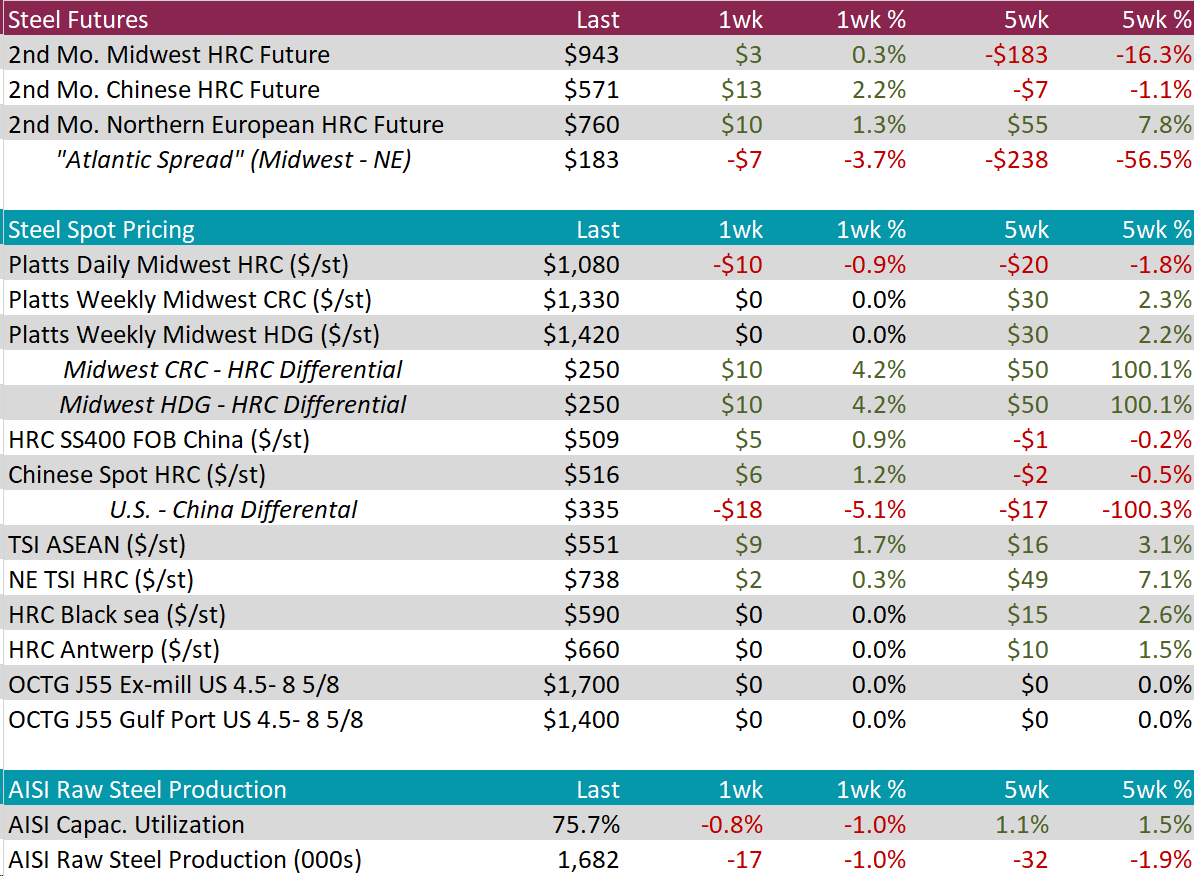 The HRC spot price fell by $10 or -0.9% to $1,080, marking the second week of declines. Meanwhile, the 2nd month future rose by $3 or 0.3% to $943, marking the first increase in four-weeks.