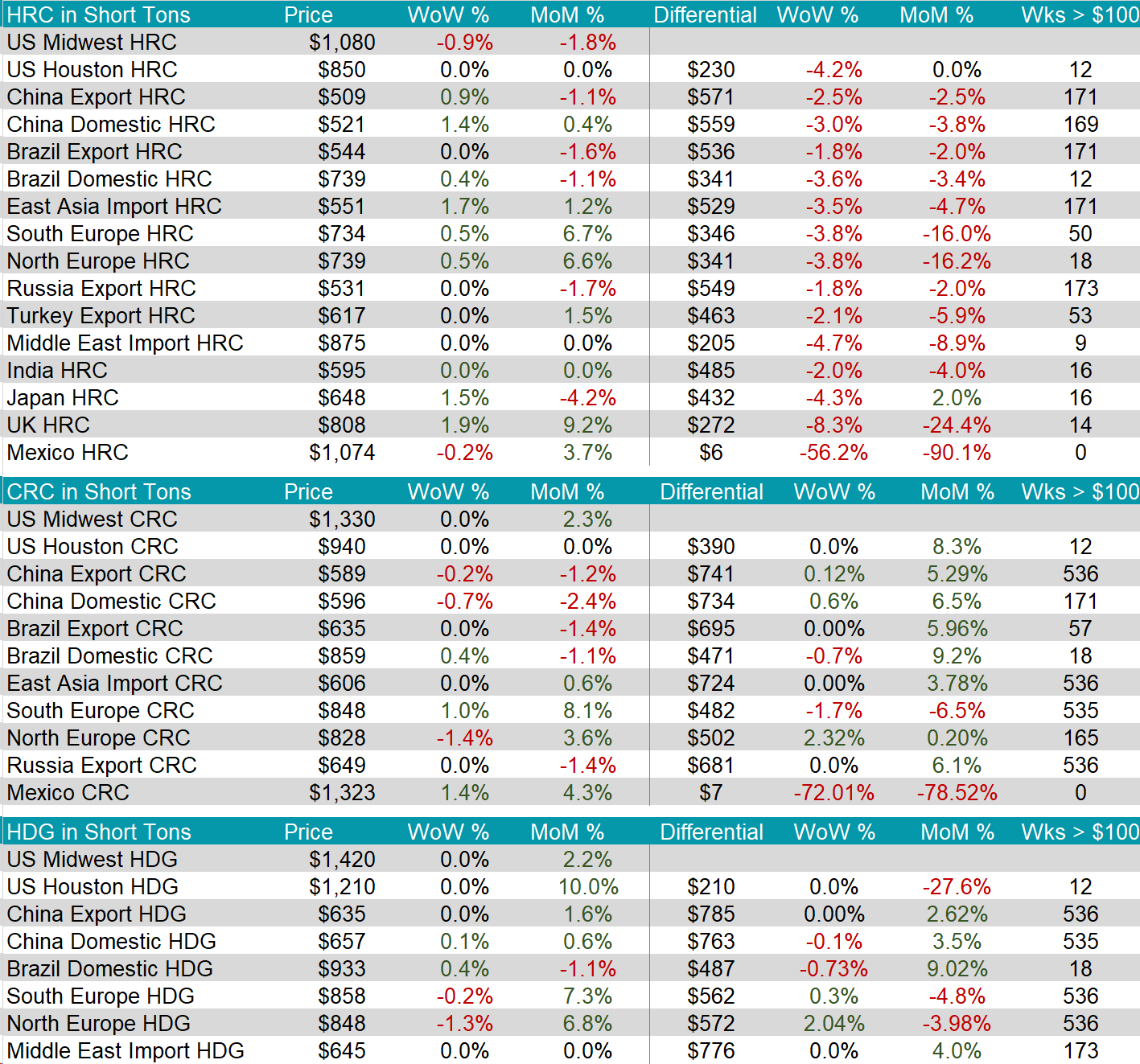 Watched global differentials were all down this week, with China Domestic HRC increasing by 1.4%. Other notable countries were East Asia Import HRC rising by 1.7% and UK up by 1.9%.