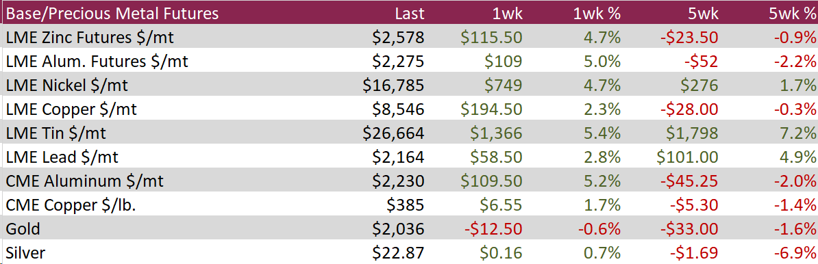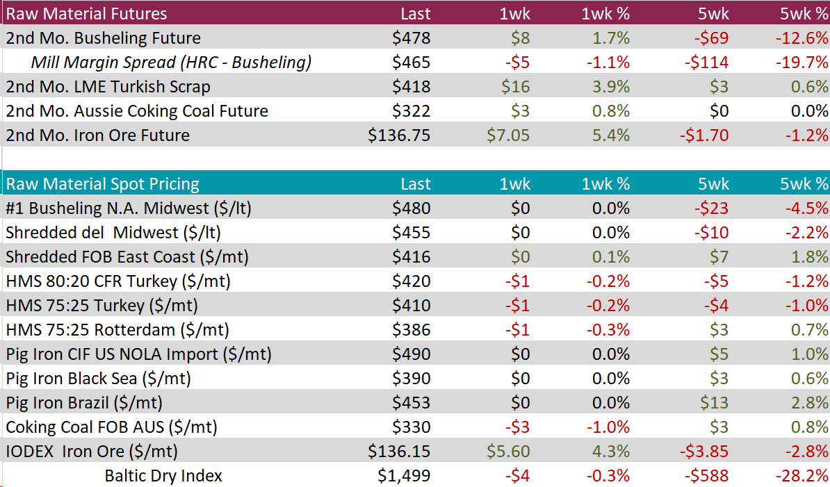 • Raw material futures all experienced increases, whereas spot pricing showed a varied trend, with most notably the 2nd month busheling future seemingly beginning to rebound from recent price drop.