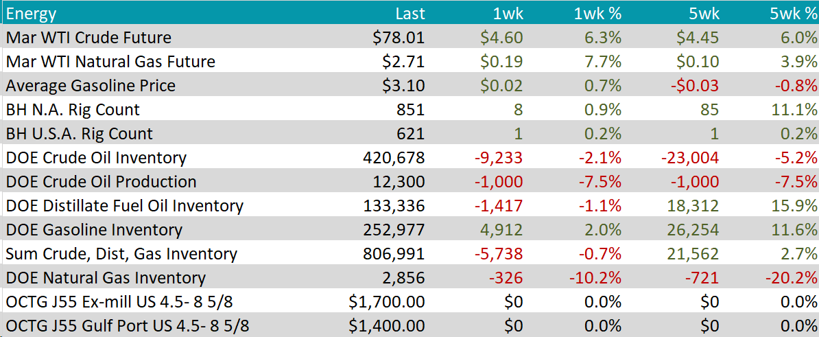 • Crude oil and natural gas futures experienced gains, paralleled by an increase in North American and US rig counts by Baker Hughes. In contrast, the aggregate inventory level dipped slightly.