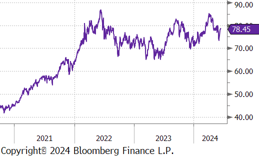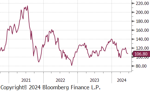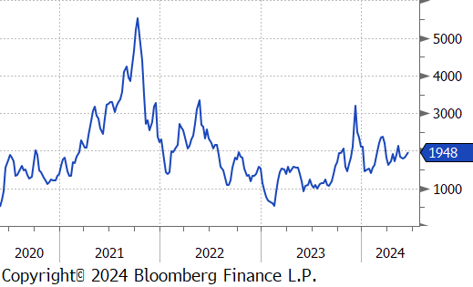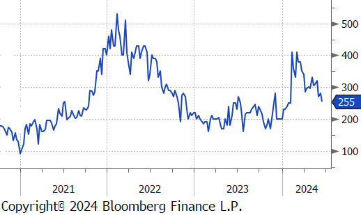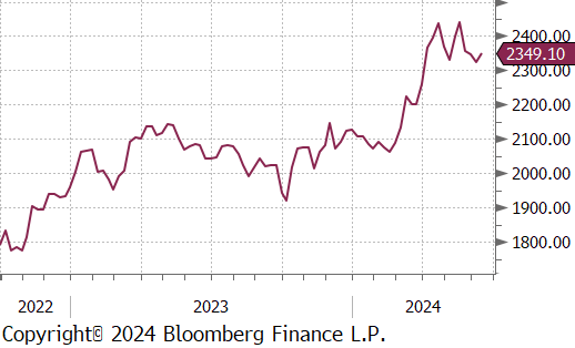 Copper futures edged down by $0.85 or -0.2% to $448, hitting a two-month low, driven by signs of weakening near-term demand. In China, the leading consumer of copper, industrial output decelerated more than expected in May. Additional economic indicators in the country such as a rapid decline in housing prices, slowing fixed-asset investment, and a contractionary official manufacturing PMI further underscored concerns that demand is unlikely to rebound in the near-term. As a result, copper inventories in China remained near their highest levels since 2020, defying typical seasonal trends that usually lead to inventory drawdowns. Consequently, the price for copper deliveries from Shanghai bonded warehouses continued to trade at a discount to LME prices for an entire month. Despite the recent downturn, copper prices are still up 10% year-to-date, buoyed by speculative investments based on anticipated shortages. Copper’s critical role in electrification, including applications in grid-scale energy storage and data-center infrastructure, continues to fuel these speculations, compounded by challenges associated with launching new mining projects for fresh ore supply.